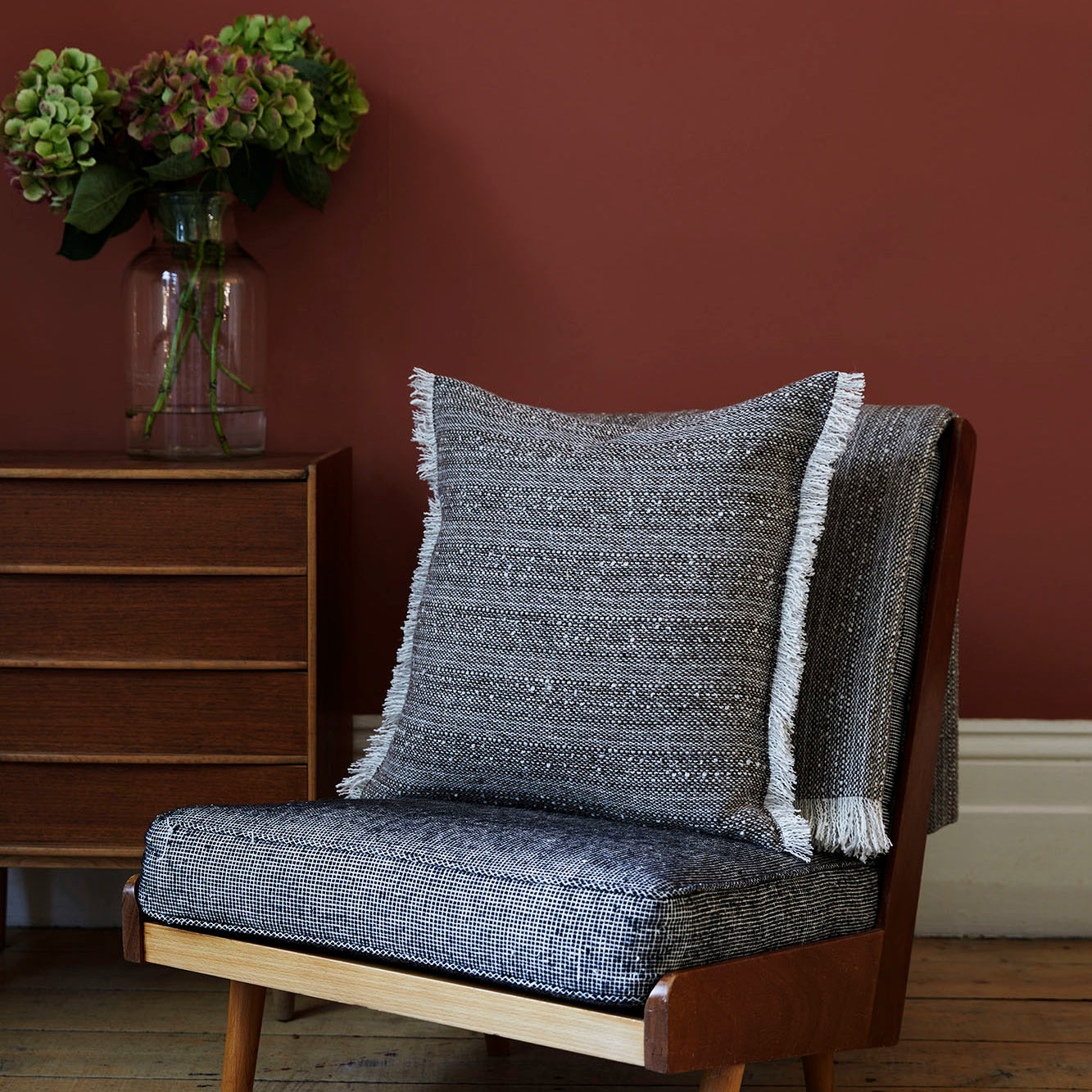 The Maldwyn Dot, with its double weave, creates a denser, warmer fabric perfect for cooler evenings. The Mended Tweed features a distinctive weaving pattern that results in a thick, warm throw, while the iconic Tweed Emphasize combines thick and thin yarns for a beautifully textured finish.