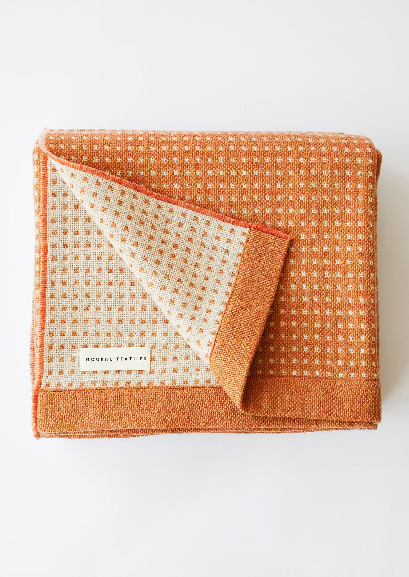 The Maldwyn Dot Ember blanket radiates warmth and vibrancy, inspired by the glowing hues of a sunset over the Mourne Mountains. Crafted from an intricate double weave, this blanket features a vibrant soft orange yarn that embodies the essence of autumn's rich foliage. The contrasting natural yarn accentuates the playful dots throughout the fabric, creating a stunning visual effect that transforms the blanket with each display.