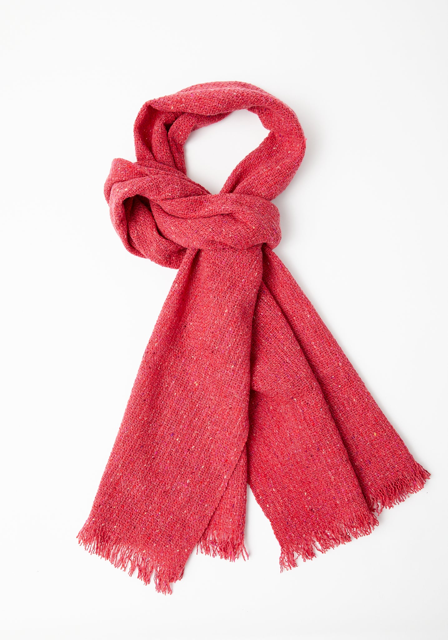 The bold, lively pink is flecked with softer shades of blush, deep purples, and natural tones, while subtle hints of red and yellow add depth, evoking the scattered colours of flowers against a natural landscape. This unique combination of hues and textures makes the scarf a statement accessory with a natural flair.