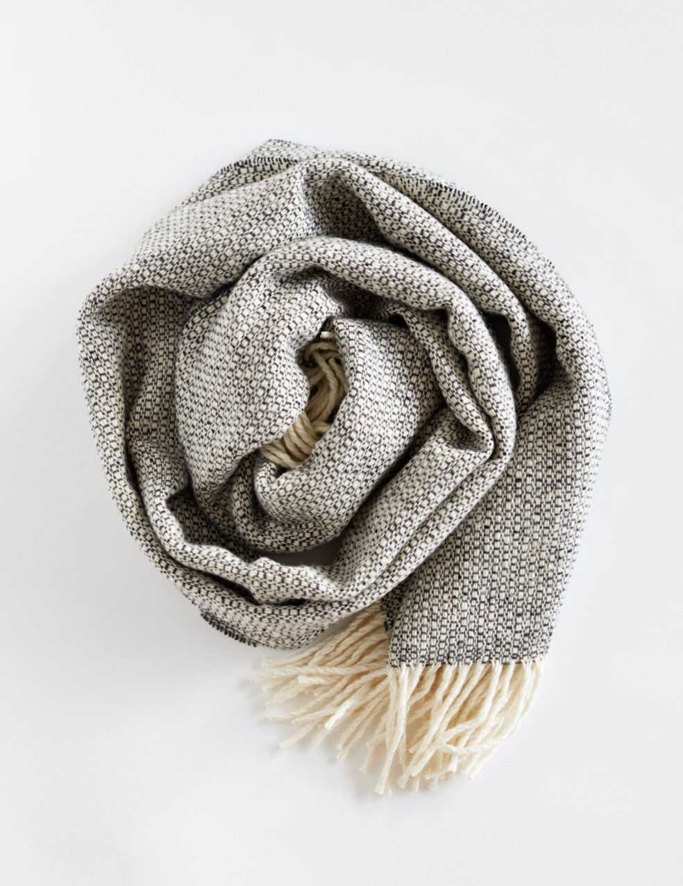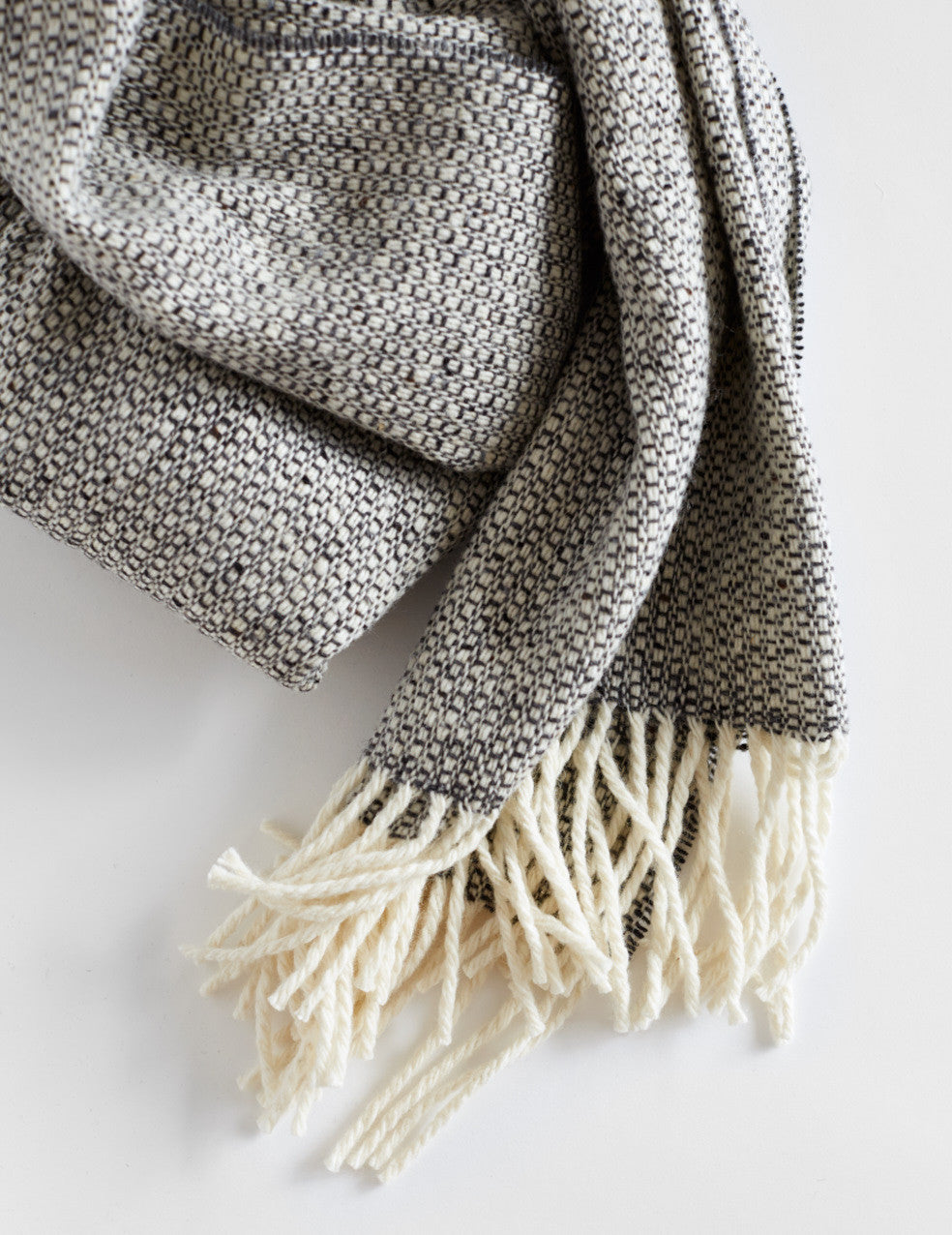 The Charcoal Grey colourway features a rich, dark charcoal grey base that creates a deep, sophisticated hue, balanced by the presence of natural undyed yarns woven throughout the design. The result is a beautifully mottled mid-grey tone, offering a contemporary yet timeless aesthetic. The subtle contrast between the dark and natural tones evokes the earthy, grounded beauty of nature, making this scarf a versatile addition to any wardrobe.