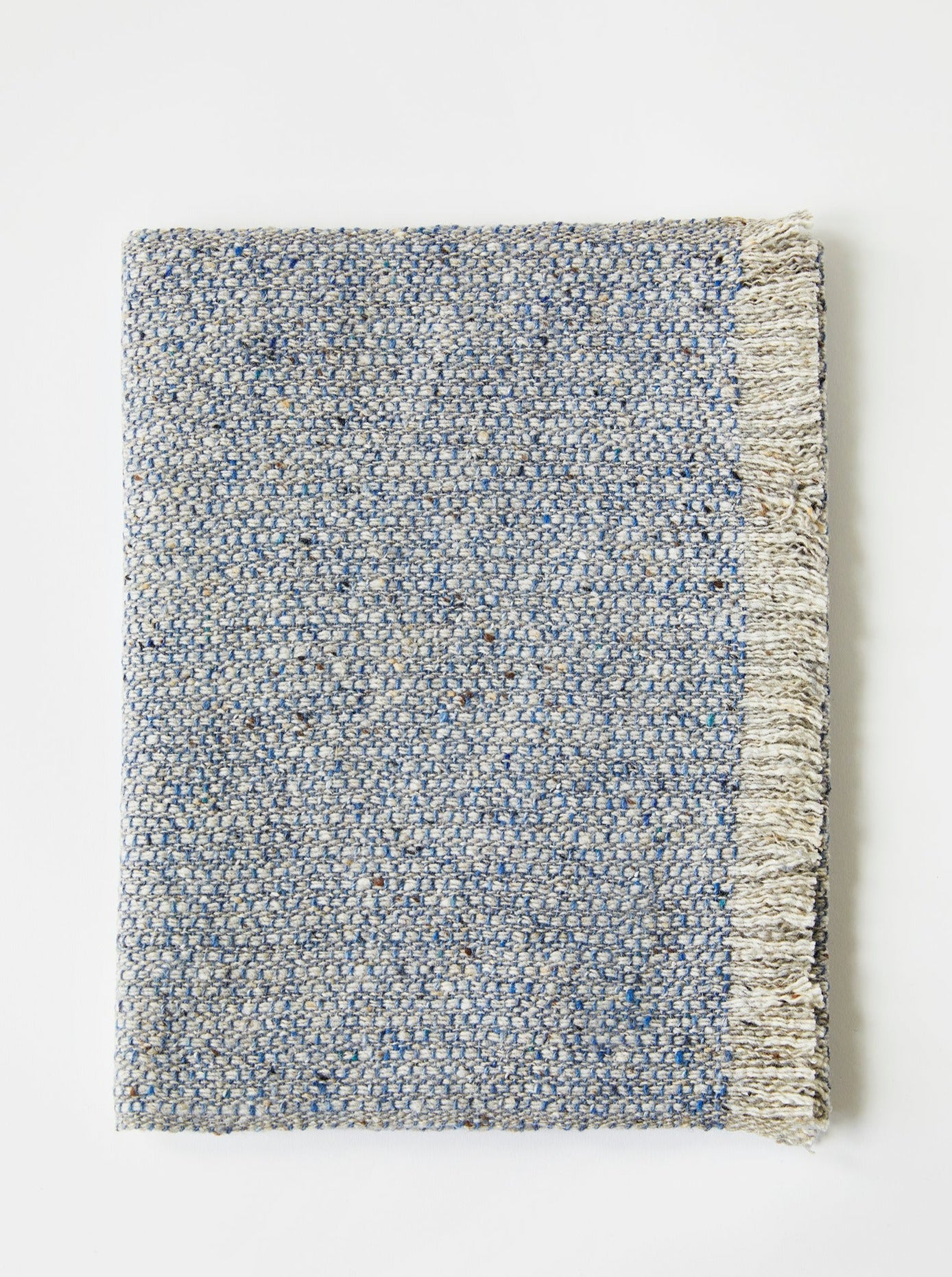 This weft is a delicate, mottled blue, enhanced by vibrant flecks of bright blue, soft sky blue, and subtle greys, with occasional hints of warm brown scattered throughout.