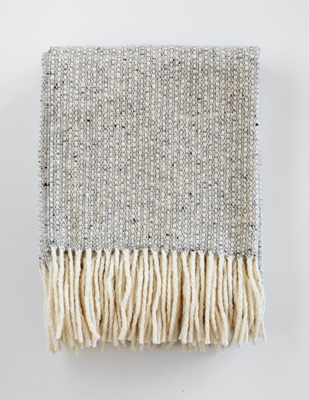 The Silver Grey colourway showcases a delicate soft silver grey base, beautifully flecked with mid greys and subtle black specks to create a striking mottled effect, akin to the movement of light across a silvery landscape. These tonal variations are further enhanced by the presence of natural undyed yarns in the warp, creating a refined contrast and adding depth to the overall design.