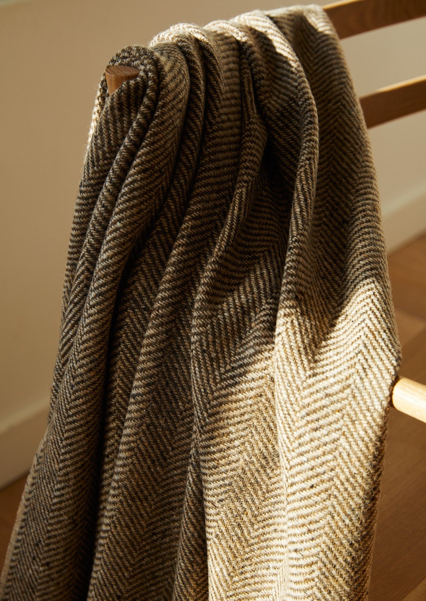 The Light Brown version of this herringbone blanket is a beautifully crafted piece that brings a timeless warmth to any setting. Woven with two carefully selected yarns, the first is an oatmeal hue with subtle flecks of warmer tones, including soft yellows, browns, and the occasional black fleck, evoking the natural colours of the Mourne landscape.