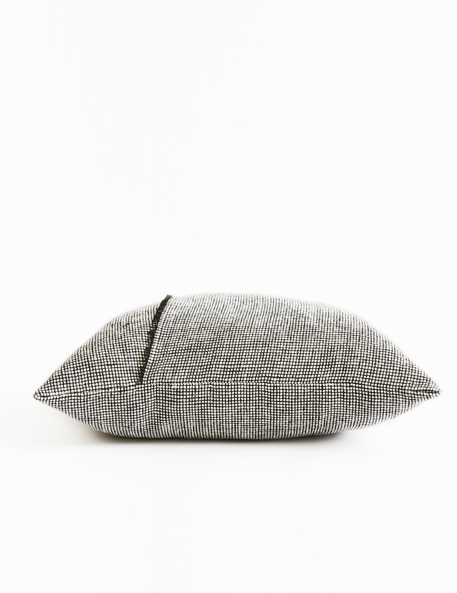 The Mourne Check Granite cushion captures the raw elegance of nature's neutral palette. Crafted with undyed natural wool yarn, it showcases warm, earthy tones reminiscent of rugged stone and weathered rock, grounded by the deep contrast of black linen threads woven throughout.