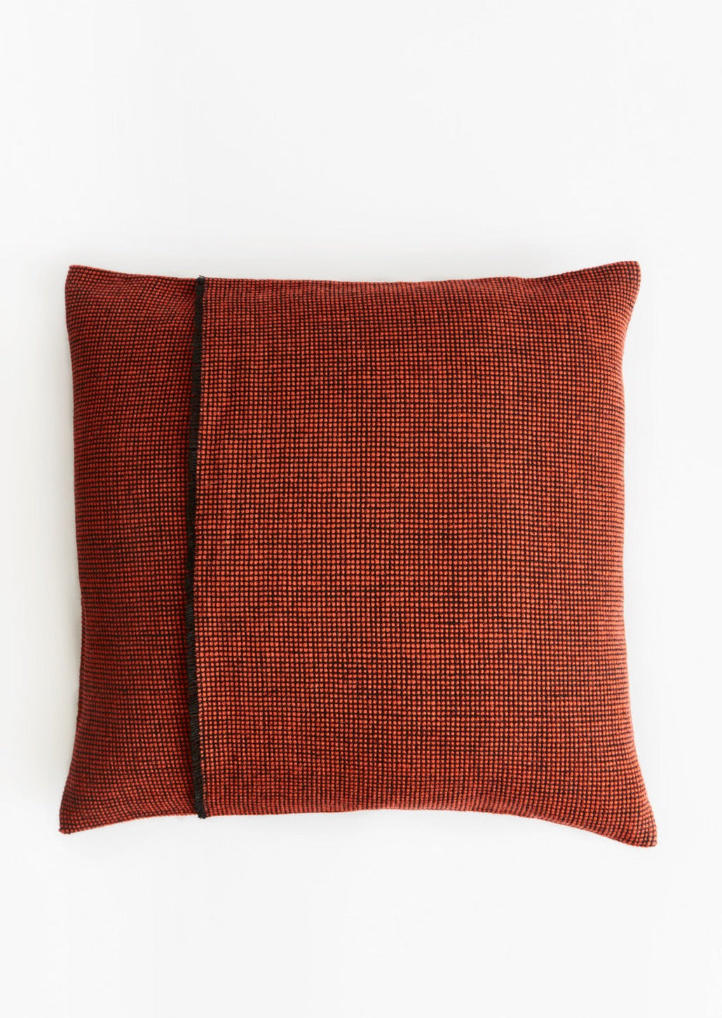 Crafted with a striking pillar-box red wool yarn interwoven with black linen, this cushion presents a classic check design with a modern edge. The rich red tones are reminiscent of wild berries or vivid blooms that stand out against the rugged Mourne landscape, creating a warm yet dramatic contrast.