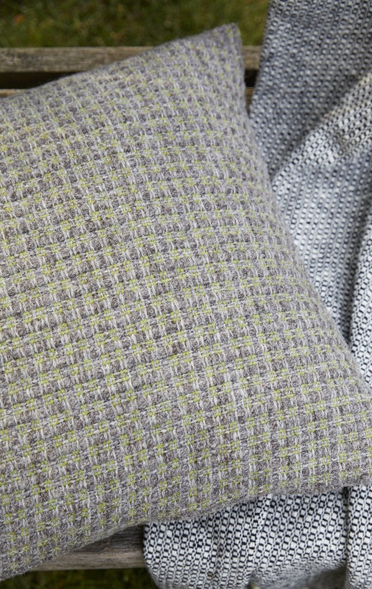 The cushion features a refreshing blend of soft green wool, mid-grey yarn, and natural undyed wool. The green yarn evokes the lush foliage that blankets the Mourne hills during spring and summer, while the mid-grey tone reflects the soft mists that roll across the landscape. The natural undyed yarn provides a grounding, earthy base, echoing the raw, untouched beauty of the mountains. This carefully balanced combination of colours creates a design that is both soothing and invigorating, with a visual depth that invites relaxation.