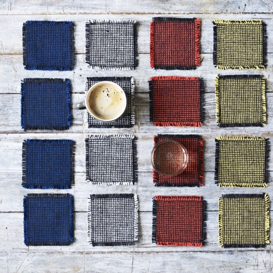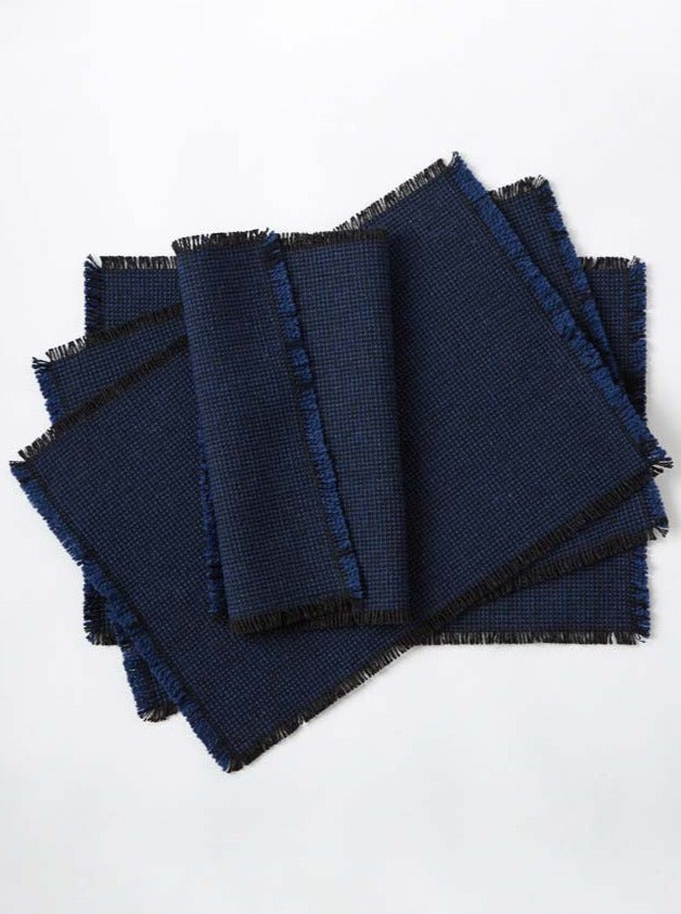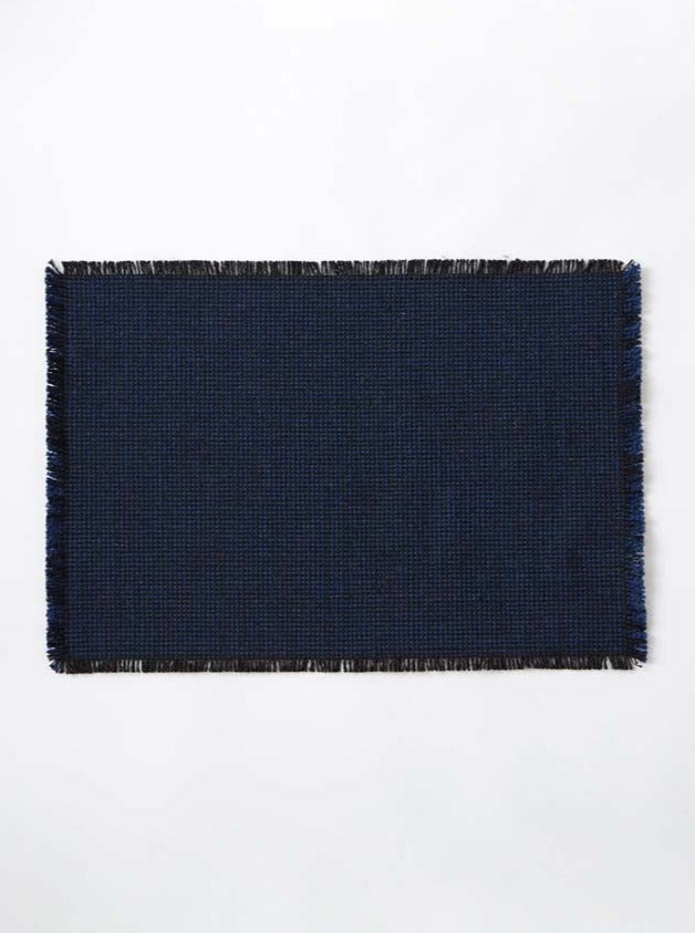 The Mourne Check Bilberry placemats are inspired by the stunning natural beauty of the Mourne Mountains, where wild bilberries grow among the heather on the rugged slopes. The rich cornflower blue dyed wool yarn evokes the deep, subtle tones of these berries, set against the stark black linen yarn. This contrast deepens the blue, creating a rich, captivating hue that mirrors the landscape’s serene yet dramatic vistas.