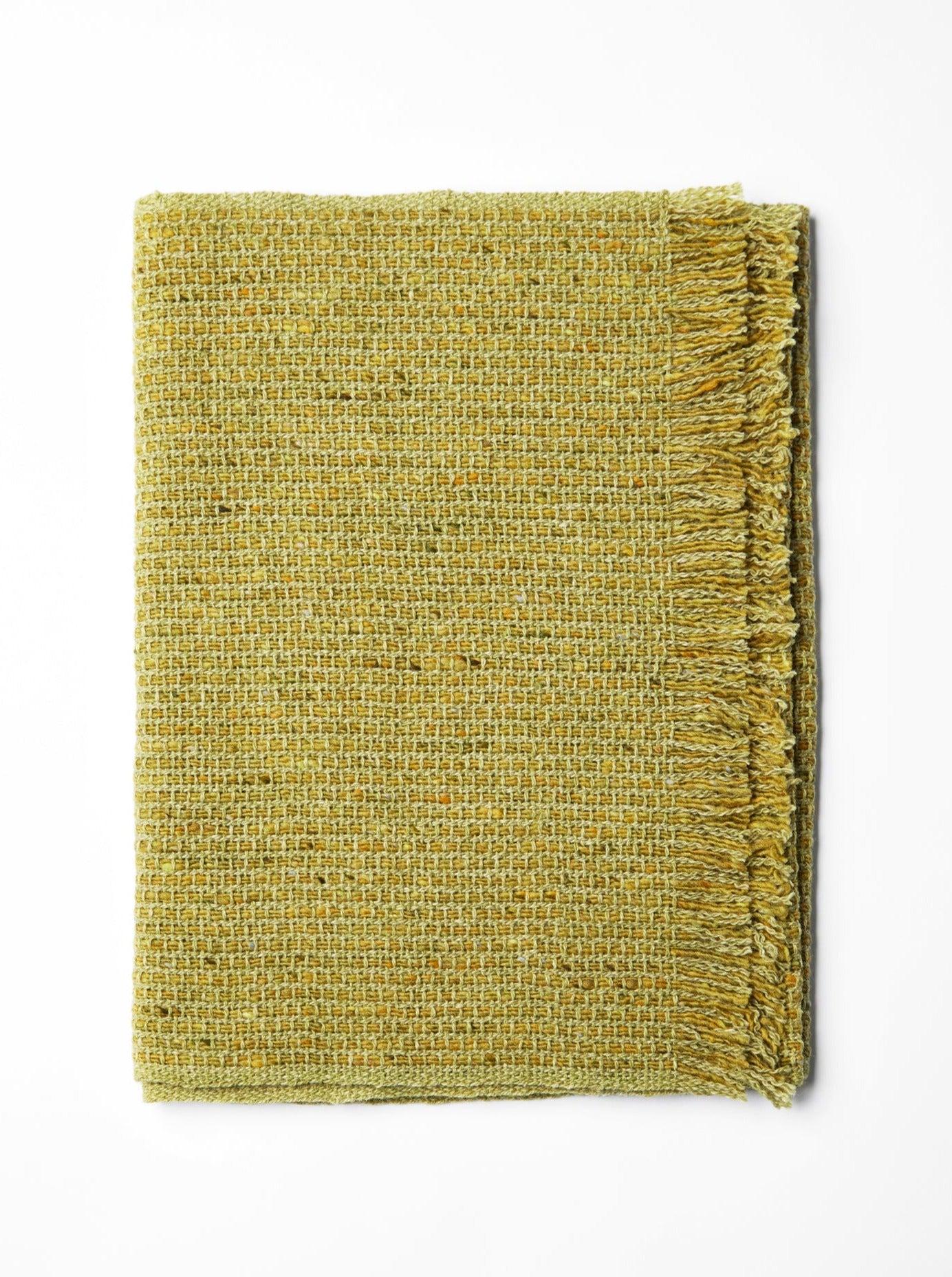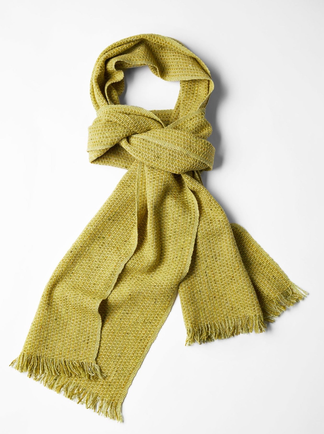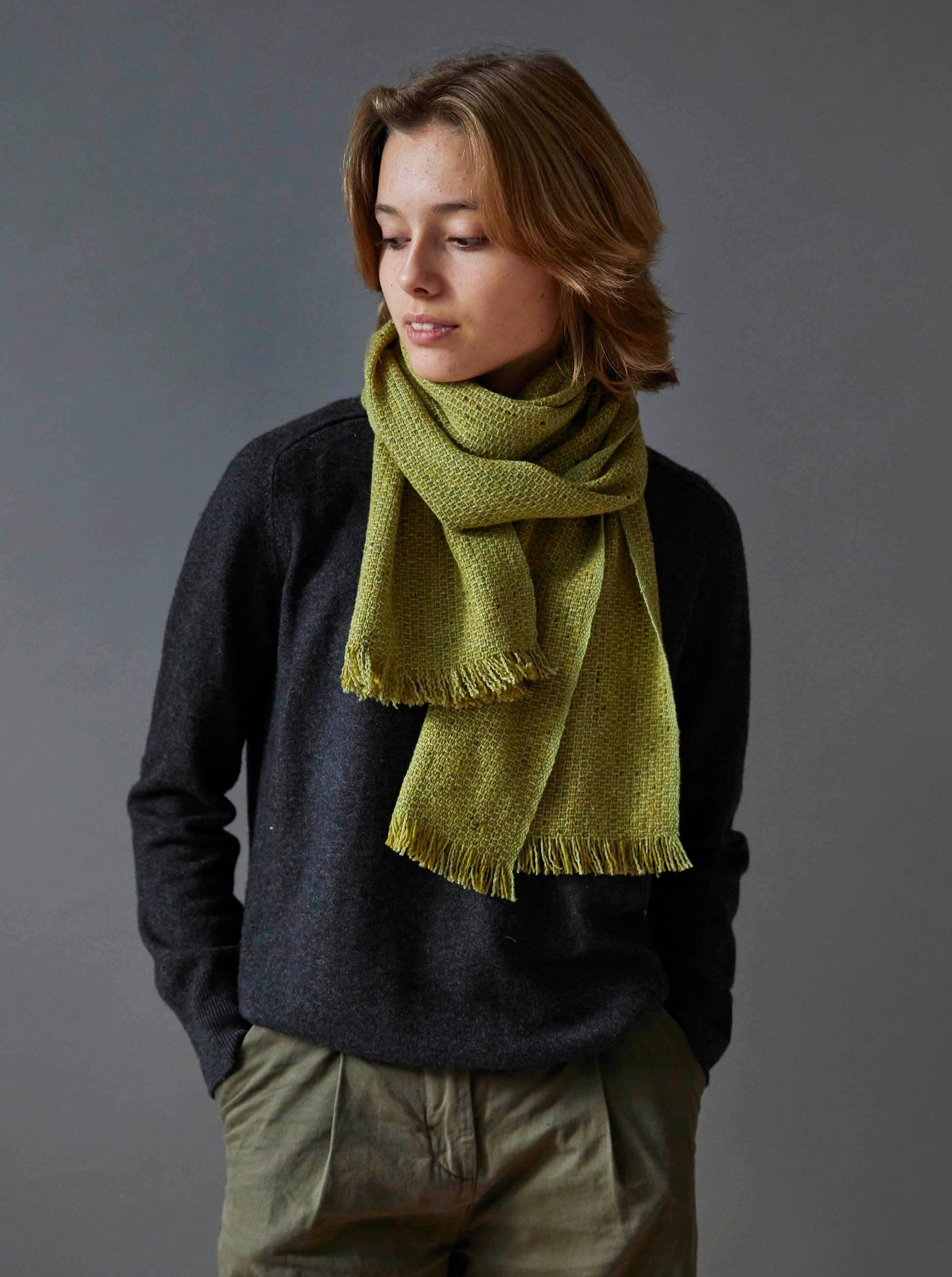 The Fen Nettle Green Scarf is a vibrant celebration of nature's rich palette, inspired by the lush flora of the Mourne Mountains. The scarf's warp is a bright, yellowy green, reminiscent of sunlit leaves and the vibrant hues of young nettles emerging in the spring. Interwoven flecks of earthy greens, warm yellows, and soft oranges dance throughout the yarn, echoing the diverse tones found in the meadows and hedgerows.