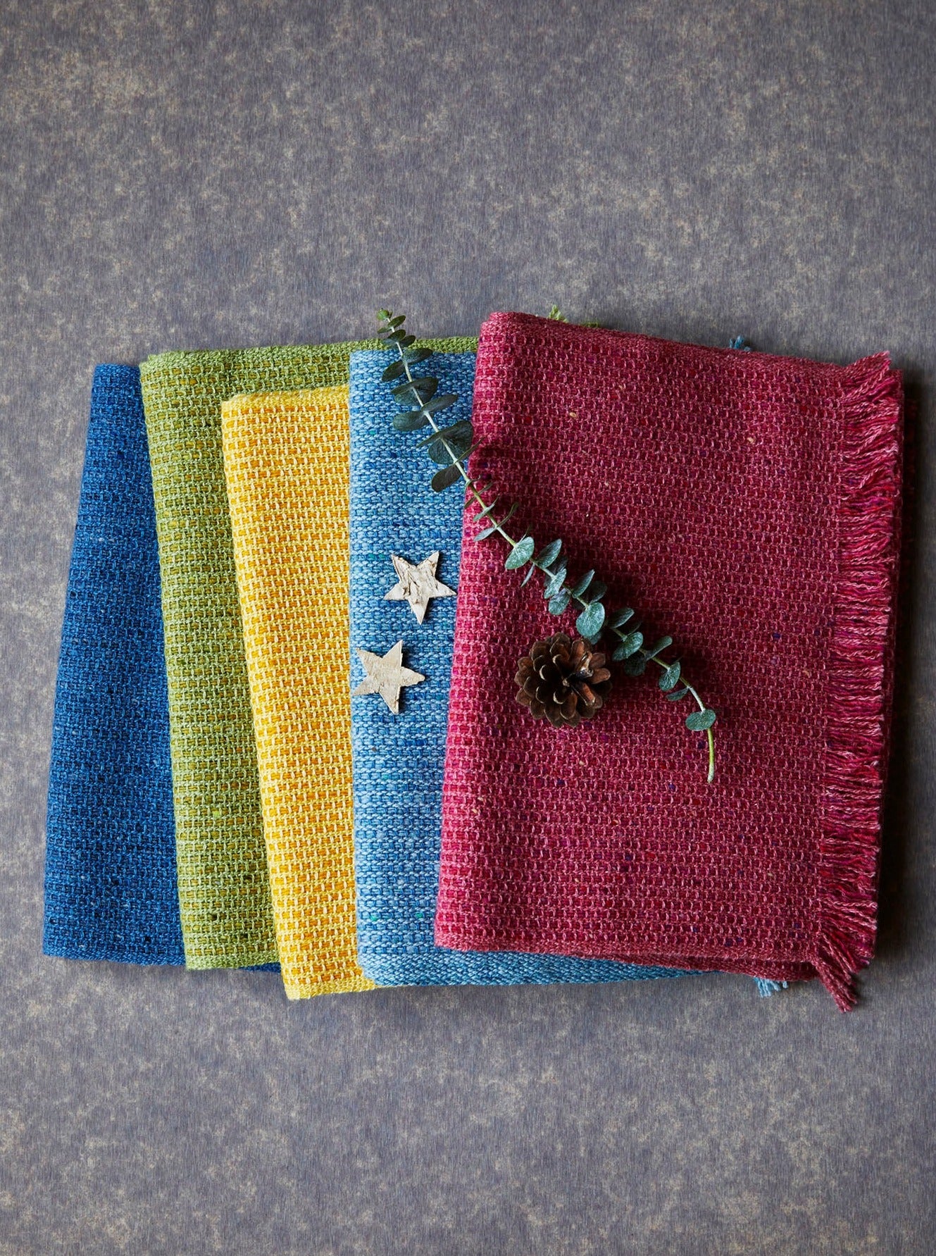 Complementing this lively base, the weft is a soothing sage green that adds depth and contrast, evoking the tranquility of shaded woodlands. Together, these colours create a harmonious accessory that captures the essence of the natural world.